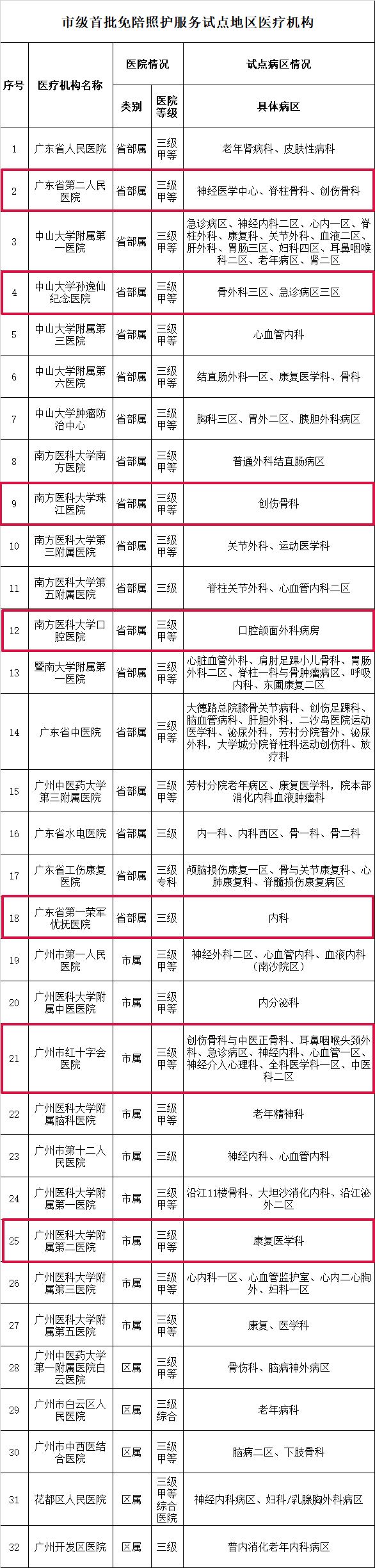 本次广州市医疗机构“免陪照护”服务试点的医疗机构覆盖全市11个区,涉及32家试点机构、69个试点病区、近4000张床位。